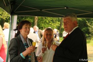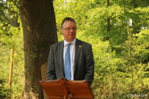 Landrat Sven Ambrosy erinnerte an einen Kreislauf, der im Wald am deutlichsten wird. „Im Wald ist Leben, Hoffnung, Zuversicht und ein guter Ort der Ruhe.“ Der RuheForst Klosterhof Grabhorn strahle in seiner Schönheit und Erhabenheit weit über den Landkreis hinaus. Auf die Veränderung der Bestattungskultur der letzten Jahre wies Bürgermeister Andreas Meinen hin. Die Gemeinde Bockhorn unterstütze den Friedhof gerne. Es sei vor fünf Jahren ein Schritt in die richtige Richtung gewesen und eine Bestätigung für sehr gutes Zusammenwirken von Gemeinde, Kirche und Familie Kaempfe. Jost Arnold, Geschäftsführer der RuheForst GmbH aus Erbach, wies daraufhin, dass die Bestattung im RuheForst eine Alternative zur bisherigen Beisetzung sei, aber keine Konkurrenz. Die RuheForst GmbH, die 2003 gegründet wurde, hat mit rund 70 RuheForst-Anlagen deutschlandweit eine Lücke geschlossen. Jost Arnold dankte der gesamten Familie Kaempfe und sprach ihr ein großes Lob für die Umsetzung und Pflege des RuheForstes mit Herzblut und Leidenschaft aus.